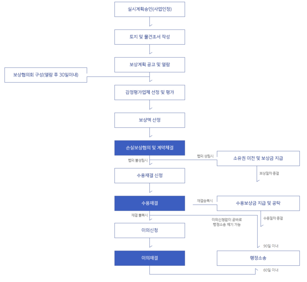 토지수용은 보상협의가 성립되지 않아 공익사업용지를 취득할 수 없다면 사업시행이 곤란해지기 때문에 토지보상법령에 정한 절차에 따라 사업시행자가 수용재결을 받아 수용개시일까지 보상금을 지급 또는 공탁하고 소유권을 강제로 취득하는 절차입니다.