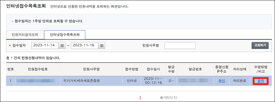 (5) 인터넷접수목록조회에서 수령방법> 출력, 또는 열람을 클릭합니다.